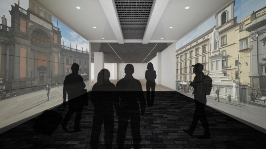 È un’installazione immersiva, multisensoriale e multicanale: 6 proiettori short throw, 16 canali audio per 16 pareti risonanti costruite con gli speaker a contatto SonanceIS4 a 3 vie, 4 sensori Microsoft Kinect, 2 sensori olfattivi e 1 dissipatori di profumi). Il sistema audio multicanale è gestito con una patch programmata in Max/Msp esportata come applicazione e il materiale audio è stato realizzato con realizzata con file audio di paesaggio sonoro registrati nella città di Napoli.